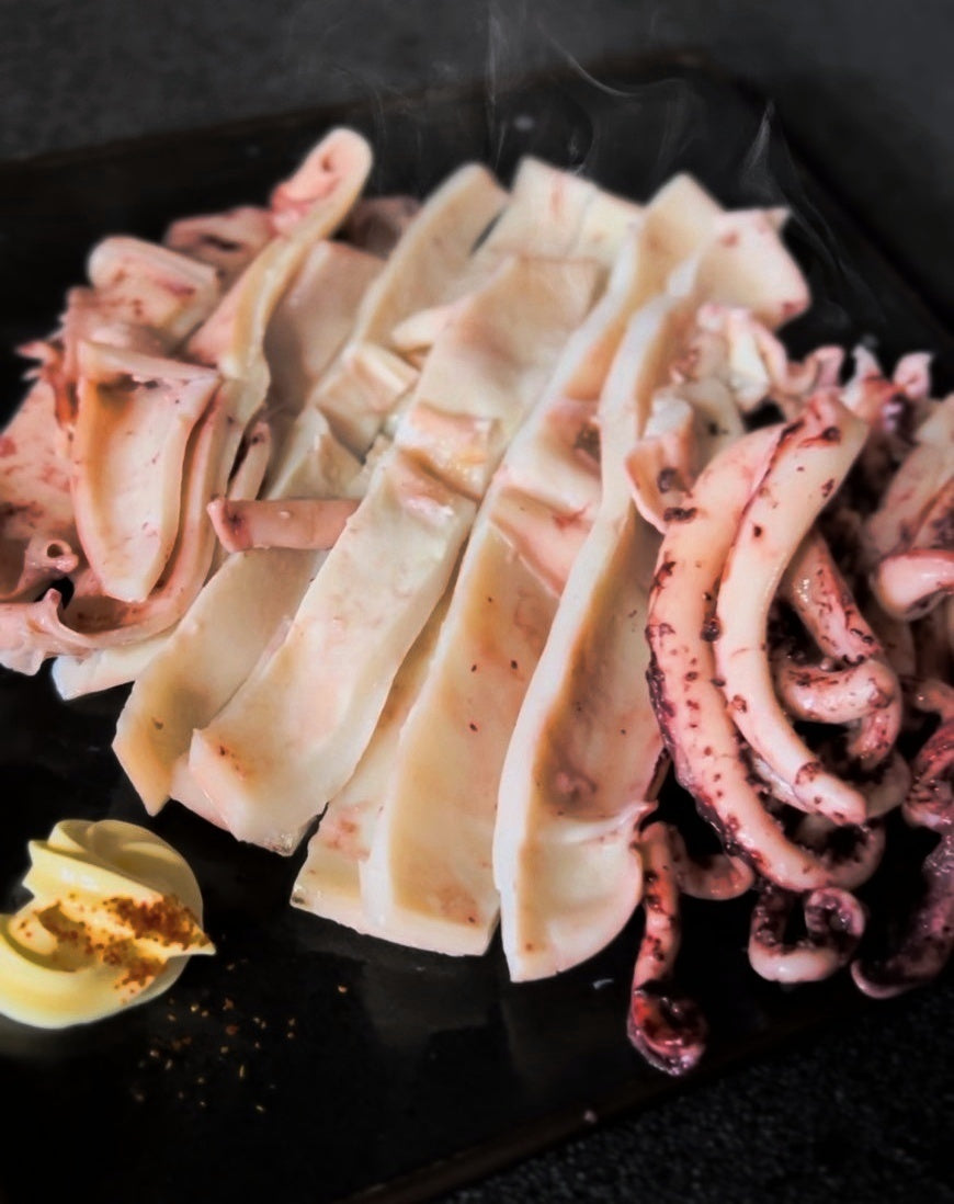 北海道羅臼産のタコイカ。肉厚で柔らかく冷めてもプリプリ食感。タコイカ本来の味を引き立てる絶妙な塩加減で仕上げておりますが、お好みでマヨネーズ、一味をかけても絶品です。そのまま焼いてお酒のお供として楽しむのはもちろん、サラダやパスタのトッピングとしてもお楽しみいただけます。今晩のもう一品にいかがでしょうか。